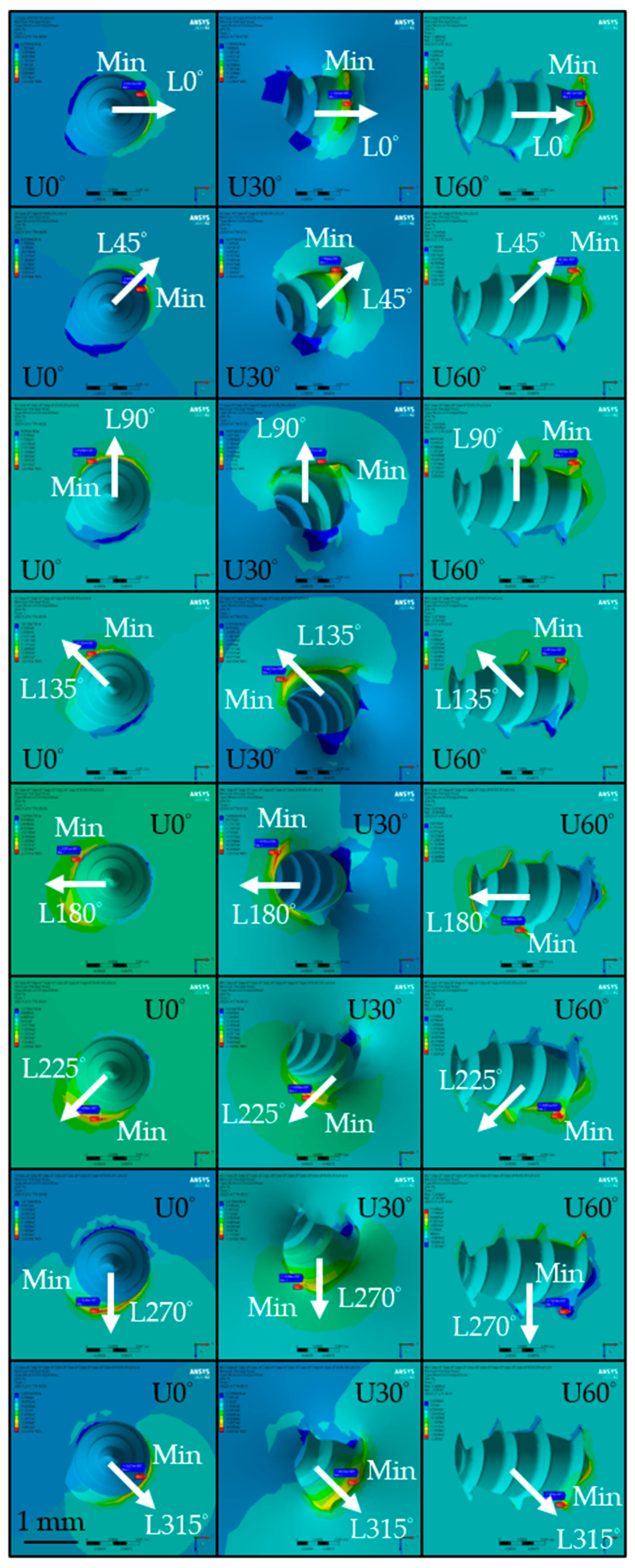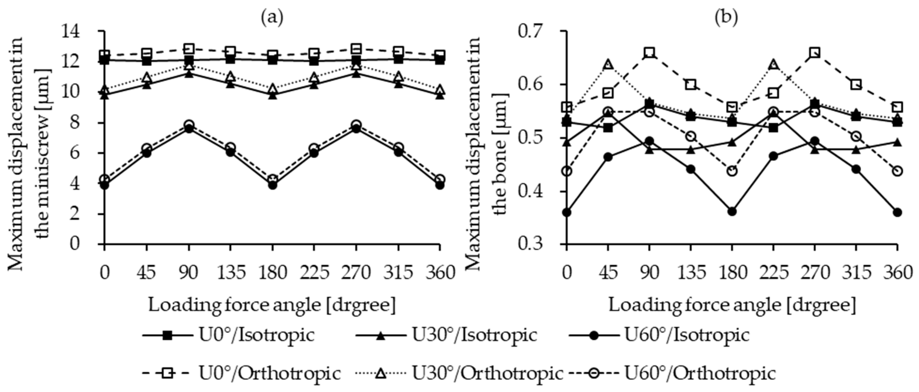 3.1. Maximum Displacement in the Miniscrew and the Bone