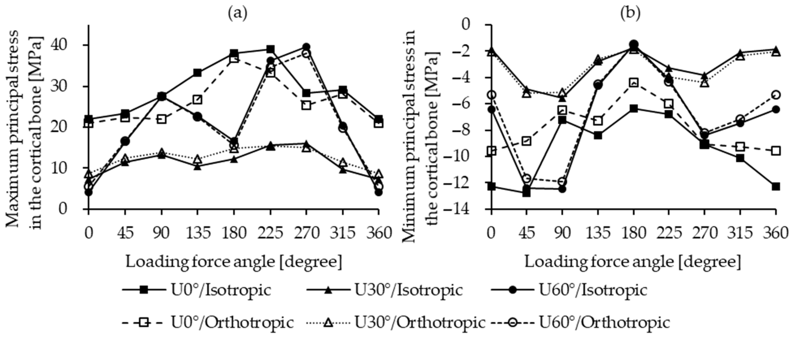 3.3. Maximum/Minimum Principal Stress in the Cortical Bone