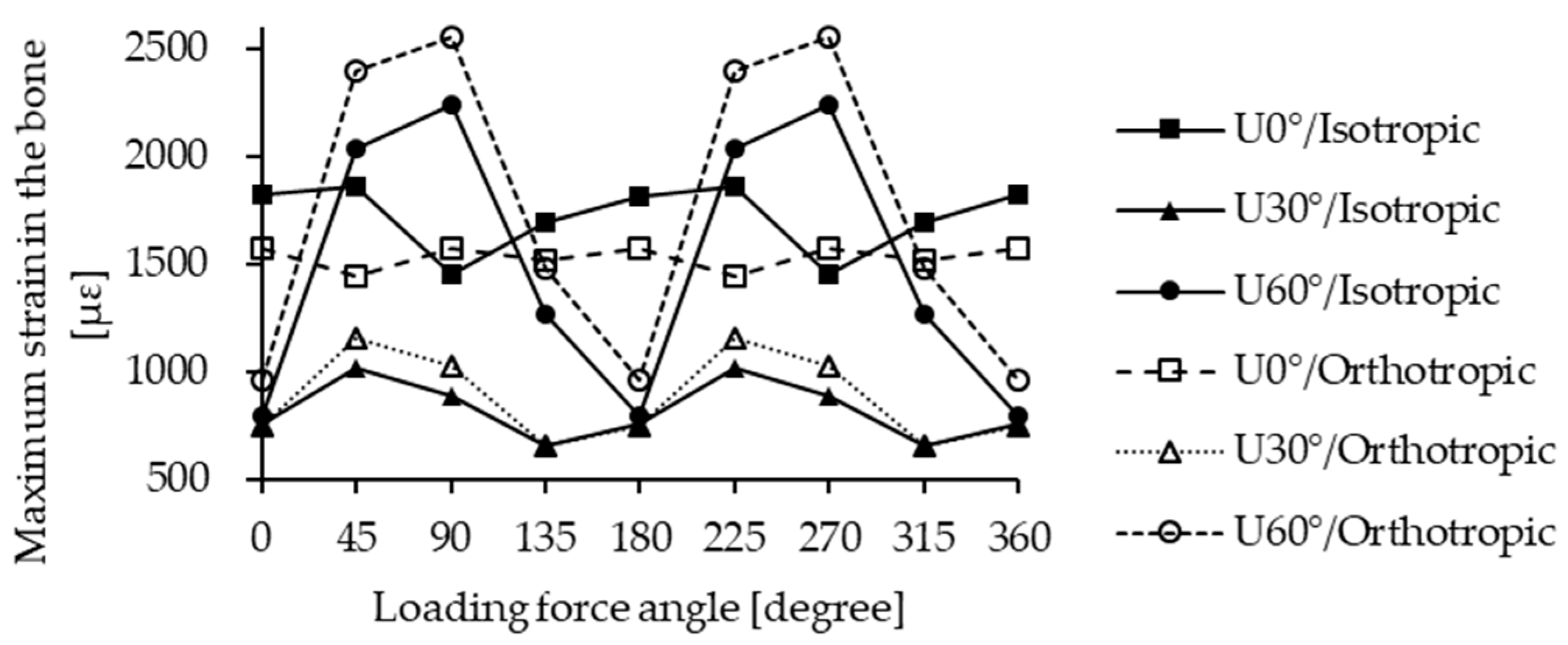 - Yang, H.; Ma, X.; Guo, T. Some factors that affect the comparison between isotropic and orthotropic inhomogeneous finite element material models of femur. Med. Eng. Phys. 2010, 32, 553–560. [Google Scholar] [CrossRef]