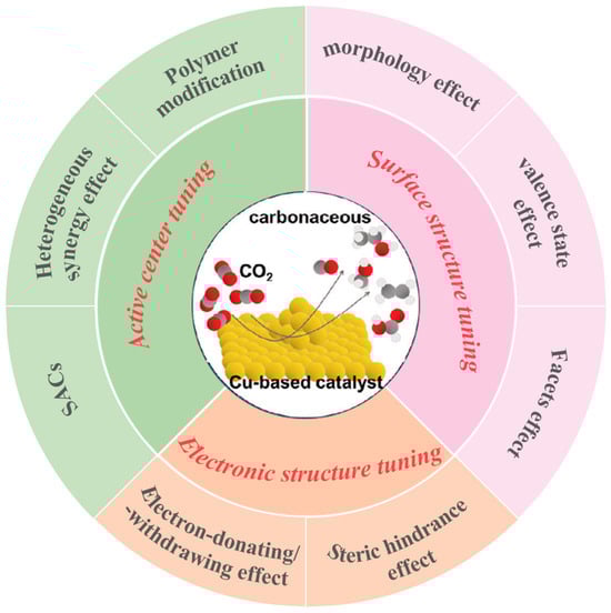 In summary, Cu-based catalysts are distinguished by their unique capability to produce multi-carbon products in CO2RR, attributed to their moderate adsorption energy for the key intermediate *CO. This characteristic establishes them as core materials for realizing high-value CO2 conversion [31]. However, challenges persist in their wider implementation, specifically the limited selective regulation of target products versus by-products, constrained by the moderate adsorption energy of key intermediates [32], and the broad product distribution arising from complex reaction pathways [33]. Fundamentally, these challenges stem from an insufficient understanding of dynamic changes in the surface electronic structure, active site density, and interfacial architecture of Cu-based catalysts during the reaction. Therefore, a deep understanding of the reaction mechanism and accurate modulation of Cu active site properties and their interactions with key intermediates are achieved through electronic effect tuning (e.g., electron-donating/-withdrawing effect [34], steric hindrance effect [35]), active center tuning (e.g., single-atom catalysts [36], heterogeneous synergetic effect [37], polymer modification [38]), and surface structure tuning (e.g., size/morphology effect [39], valence state effect [40], crystal facet effect [41]). This systematic approach constitutes the core pathway to enhance catalytic performance metrics, including activity, selectivity, and stability, as illustrated in Figure 1. This review aims to systematically synthesize the application advantages and catalytic mechanisms of Cu-based catalysts in CO2RR, with a focus on recent regulatory strategies derived from electronic effects and structural design, as well as interconnections. It seeks to offer a robust theoretical foundation and practical guidance for the rational structural and performance enhancement of Cu-based catalysts, thereby facilitating the practical implementation and advancement of high-efficiency CO2RR technology [42,43,44].