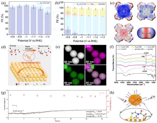 Enhanced CO2 reduction performance of Cu-based catalysts is achieved by modulating electron transfer efficiency between donors and acceptors. For instance, Wan et al. [57] developed an aminothiol ligand-modified Cu catalyst, systematically investigating how ligand structure impacts CO2 reduction performance through the construction of stable organic–inorganic interfaces. The amino group in aminothiol acts as an electron donor, forming electronic coupling with copper active centers as electron acceptors through strong N−Cu bonds. The donor transfers electrons to the copper surface, which significantly enhances its electron density and provides sufficient electrons for the initial activation of CO2. Simultaneously, the cooperative interaction between N atoms in the ligand and Cu surface sites modulates the electron-rich environment of the active centers and lowers the activation energy required for the C−C coupling reaction in Figure 2h.