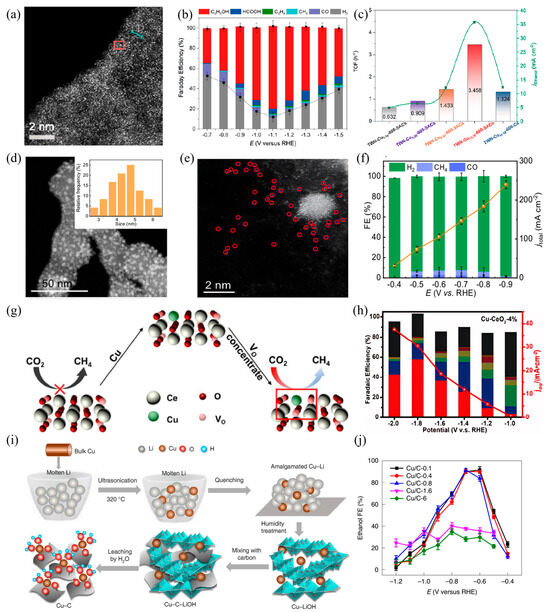 (a) HAADF-STEM images of TWN−Cu13.35−600−SACs, (b) The Faradaic efficiency and the product distribution at different potentials, (c) TOF, and partial current densities for ethanol conversion (blue line) tested at −1.1 V for TWN−Cux−600−SACs and TWN−Cu14.18−600−Cs, (d) HAADF-TEM image (inset shows particle size distribution), (e) aberration-corrected HAADF-STEM image. The red circle marks the well-distributed Cu atoms in M-Cu1/CuNP. (f) The Faradaic efficiency and total current density of Cu−N−C at different potentials, the data were averaged over three repeated measurements. (g) Schematic diagram of the reaction pathway, CO2 cannot be deeply reduced to CH4 on CeO2 catalysts. (h) The Faradaic efficiency (bars, left y-axis) and deep reduction products current density (jdrp, red curves, right y-axis) of Cu−CeO2−4%, (i) Step-by-step preparation of the carbon-supported Cu SA catalyst using an amalgamated Cu−Li method, (j) The Faradaic efficiency of CO2−to−ethanol at different potentials over catalysts of different Cu loadings.