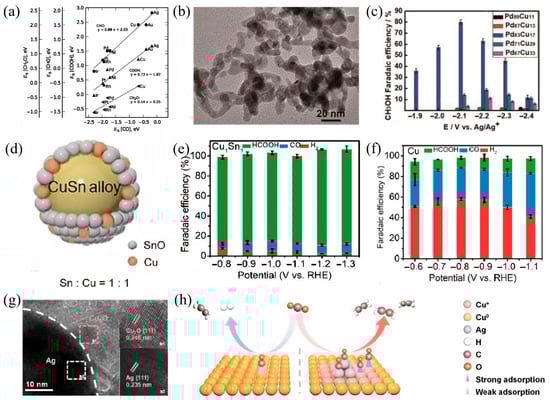 (a) Linear relationships between different reaction intermediates (scaling relationships), (b) TEM image of Pd83Cu17, (c) The Faradaic efficiency for CH3OH over PdxCuy aerogels, (d) Schematic of Cu−Sn alloy, (e) The Faradaic efficiency of different products for Cu1Sn1 alloy, (f) The Faradaic efficiency of Cu, (g) HRTEM image of the Ag−Cu2O−0.10, (h) Schematic for enhanced C2H4 formation over Ag−Cu2O.