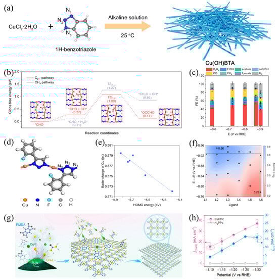 (a) Schematic illustration of the synthesis procedure, (b) Gibbs free energy diagram of CO2RR to C2+ and CH4 pathway on Cu(OH) TA slab. Inset figures: top-view geometries of intermediates (*CHO, *CHO+*CO, TSC-C, and *OCCHO) along CO2-to-C2+ pathway on Cu(OH) BTA slab. (c) The Faradaic efficiency of all products under different applied potentials over Cu(OH) TA in 1 M KOH electrolyte, (d) The Cu−N coordination models in the modeling, (e) The relationship between Bader charge of Cu in Ln−Cu and HOMO energy of the ligands. The lines is HOMO energy of ligands tunes Cu electronic states. (f) Colored contour map of ηC−C coupling. The coloured contour map showed the ηC–C coupling increasing from −0.76 to −0.96V in all Ln-Cu samples. (g) Schematic illustration of the synthesis and structure of CuPPc, (h) Total CO2RR current density and CH4 partial current density on CuPPc and H2PPc.
