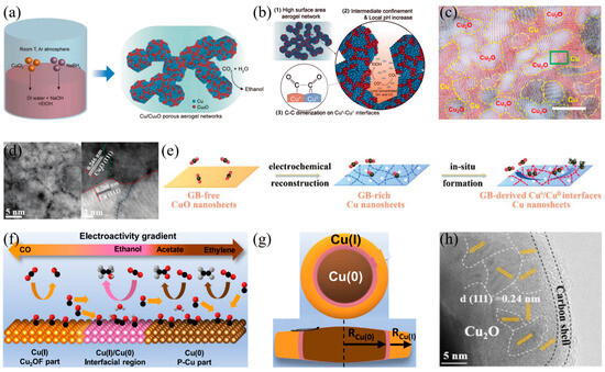 In CO2RR, tuning the valence states of Cu-based catalysts significantly affects product selectivity. Different Cu valence states (e.g., Cu (I), Cu (II), and Cu (0)) directly change the surface electronic structure of the catalyst, which in turn influences its interaction with reaction intermediates and ultimately determines the CO2 reduction pathway and product distribution [108]. This characteristic has made Cu-based catalysts a focus in research on converting CO2 into high-value-added chemicals. Researchers modulate the valence state distribution of copper through diverse strategies to enable efficient generation of target products. Kim et al. [109] reported a Cu/Cu2O aerogel characterized by high specific surface area and a porous network structure, fabricated through a redox reaction between metal precursors and a reducing agent in Figure 8a. When applied to CO2RR, this material exhibited a Faradaic efficiency of 41.2% for ethanol at a partial current density of 32.55 mA cm−2. Studies showed that the widely distributed Cu0−Cu+ interfaces in the Cu/Cu2O aerogel and the increase in local pH during the reaction are key factors promoting the conversion of CO to ethanol in Figure 8b. Building on studies of Cu/Cu2O composite structures, Zhang et al. [110] proposed a bicontinuous b−Cu2O/Cu electrocatalyst (b−Cu2O/Cu). It consists of ultra-small Cu2O nanodomains, Cu nanodomains, and abundant grain boundaries between them in Figure 8c. This structure facilitates the formation of *CO, *CO−CO coupling, and *CO−*OCCO coupling. Thus, the Cu2O/Cu catalyst exhibited a Faradaic efficiency of 12.1% for CO2 reduction to propanol at −1.1 V (vs. RHE), with a partial current density of 101.6 mA cm−2.