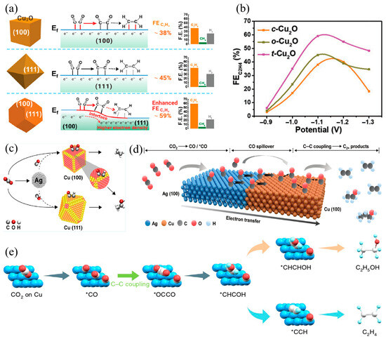 In the electrochemical CO2 reduction reaction, the crystal orientation of catalysts plays a decisive role in governing the adsorption energy and reaction pathways of key intermediates. This influence is exerted by changing the electronic properties and geometric configurations of active sites, which ultimately determines the distribution of reduction products. Hori et al. [114] first reported the structure–activity relationship between crystal planes and product selectivity in electrochemical CO2 reduction in 1995. Their results demonstrated that Cu-based nanocatalysts with different exposed crystal facets yield various carbon-containing products under identical conditions [115]. The close-packed Cu (100) crystal facets are more favorable for C2 product formation due to their low activation energy for C−C coupling: a conclusion further supported by Gao et al. [116] combined experimental and Density Functional Theory (DFT) study on Cu2O crystal facets. They found that, consistent with the behavior of metallic Cu (100), the Cu2O (100) crystal facet exhibits a strong affinity for CO adsorption, this adsorption preference, confirmed by DFT calculations, reduces the energy barrier for *CO dimerization by 0.3 eV compared to Cu2O (111) facets in Figure 9a. As a result, t−Cu2O achieves the highest C2H4 selectivity (up to 68%) among the three Cu2O phases, as shown in the selectivity comparison in Figure 9b. In contrast, Cu (111) crystal facets exhibit higher selectivity toward C1 products [117]. Thus, when designing high-performance Cu-based electrocatalysts, the crystal facet effect on catalytic performance must be comprehensively considered, whether for metallic Cu or Cu-based oxides like Cu2O, exposing (100) facets emerges as a viable strategy to enhance C2 product selectivity.