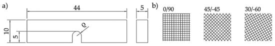 (a) Schematic of fracture SENB specimens. Nominal dimensions (in mm), with ρ being 0.0 mm, 0.5 mm, 1.0 mm, and 2.0 mm; and (b) raster orientations.