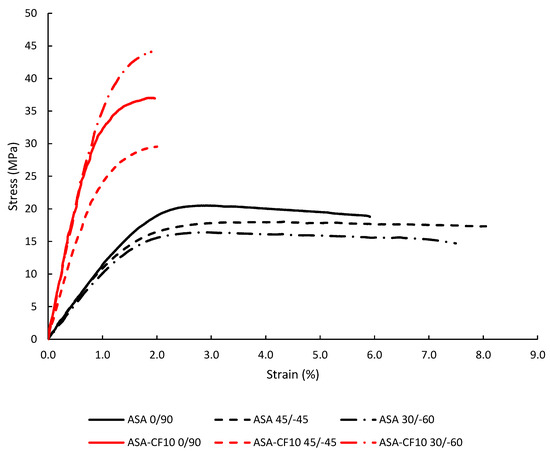 Acrylonitrile-styrene-acrylate (ASA) is a high-performance thermoplastic widely used in FFF 3D printing, prized for its excellent mechanical properties and resistance to UV radiation and weathering [32,33,34,35]. It exhibits robust mechanical properties [36,37,38], including high impact strength [39], wear resistance [40], and durability [41]. Carbon-fiber reinforced ASA is an emerging material that significantly enhances the mechanical properties of the base polymer, such as tensile strength and stiffness [42,43,44]. The resistance of ASA to environmental degradation makes it particularly well-suited for outdoor components, in addition to its use in prototyping [44,45,46,47]. Thus, ASA is a very good alternative to the widely used acrylonitrile-butadiene-styrene (ABS). Although their compositions and mechanical properties are similar, ASA is more durable in harsh environments [35,48]. Additionally, since ASA is generally reported to have moderate mechanical properties, this research also includes carbon-fiber reinforced ASA (10 wt.%, ASA-CF10), with the aim of exploring how the introduction of carbon fibers affects the corresponding mechanical performance.