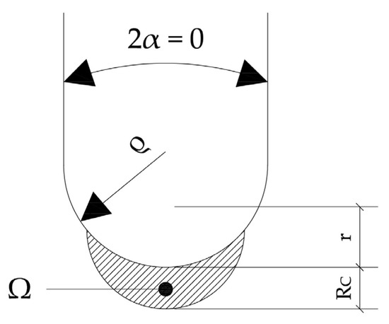 The ASED criterion necessitates the calculation of the strain energy density averaged over a defined control volume circumscribing the notch tip. For two-dimensional (plane) analyses, this control volume is represented as a circle or a circular sector with a characteristic radius, RC. In instances where the notch opening angle (2α) is zero, characteristic of U-notches, RC can be quantitatively determined using the fracture toughness (Kmat) of the material, ultimate tensile strength, and Poisson’s ratio (ν) [56].