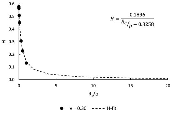 During the analysis, the ratio of the critical radius to the notch radius (RC/ρ) exceeded unity. This necessitated the extrapolation of H values [16], tabulated in Table 3, utilizing the fitting function presented in Figure 4. This extrapolation was critical to ensure the accuracy and completeness of the analytical results.