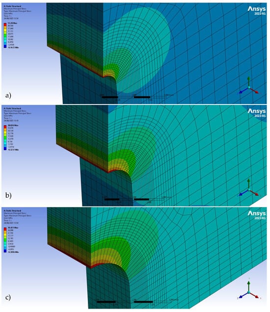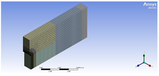 The determination of the external load corresponding to the maximum stress at a notch tip can be achieved through numerical or analytical methods. Finite element simulations offer a robust numerical approach for this derivation. The stress field within the mid-plane of the fracture section (at the notch tip) was analyzed for all specimen geometries using a FE model developed in Ansys (2023 R1) [27]. A quarter-model approach, exploiting the symmetry inherent in fracture tests, was employed (Figure 5), assuming linear-elastic material behavior (material properties from Table 1). A refined mesh was implemented in the vicinity of the notch tip due to the high sensitivity of stress concentration to mesh size in this region. For every nominal notch radius, the mesh sizes were 61,435 nodes and 13,620 elements for ρ = 0.5 mm; 59,124 nodes and 13,090 elements for ρ = 1.0 mm; and 70,316 nodes and 15,670 elements for ρ = 2.0 mm.