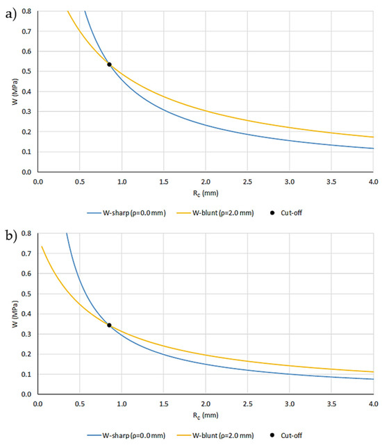 The parameter F(2α) is contingent upon the notch opening angle, with a value of 0.785 for U-notches (2α = 0). H depends on both the notch geometry (opening angle, 2α, and notch radius, ρ) and the material properties (critical radius, RC). σmax represents the maximum elastic stress at the notch tip. Table 3 provides a compilation of H function values for U-shaped notches [58] for a material with a Poisson’s ratio of 0.30 [49,50].