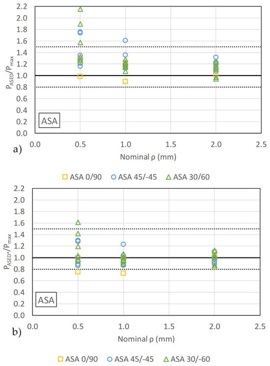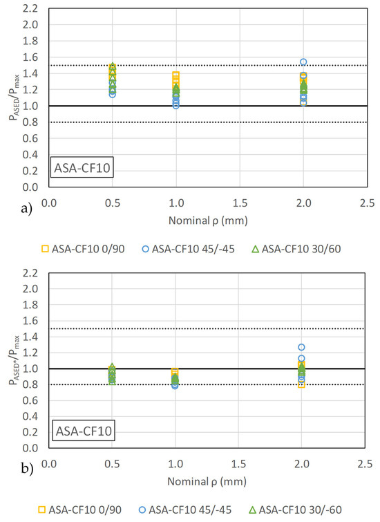 The fracture predictions by standard ASED criterion (shown in Figure 8a for ASA, and in Figure 9a for ASA-CF10) are non-conservatives in general, with few results becoming conservative. PASED/Pmax ratios exhibit comparable values for different notch radii, except for ASA 45/−45 and 30/−60 with a notch radius of 0.5 mm, in which the precision is lower.