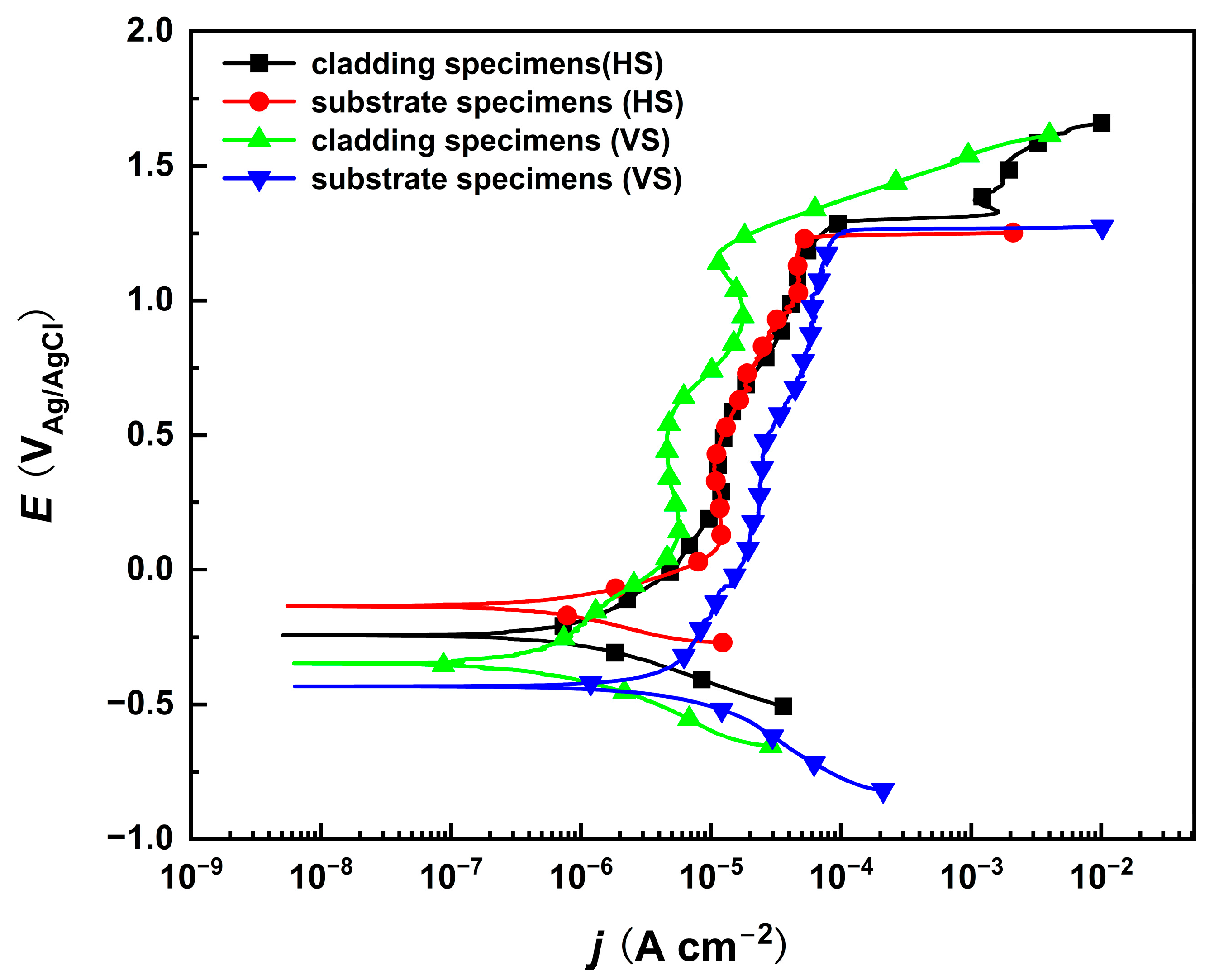 Figure 2. The corrosion potentials of both the substrate and the cladding layer on the HS surface are higher than those on their respective VS surfaces. This indicates that the HS surface has a preferential tendency to corrode. In the passive region where the current density changes very slowly within a certain potential range, the corrosion current density of the cladding layer is slightly lower than that of the substrate, implying that a compact passive film is produced on the cladding specimen. Although the corrosion rate differs in the passive region, the polarization curves indicate that the passivation breakdown potential remains consistent. This indicates that both the cladding layer and the substrate exhibit identical transpassive dissolution tendencies on their HS and VS surfaces near a specific transpassive potential, which is favorable for subsequent anodic dissolution experiments. However, due to the significant microstructural differences between the cladding layer and the substrate, further characterization and analysis of the dissolution morphology are still required.
