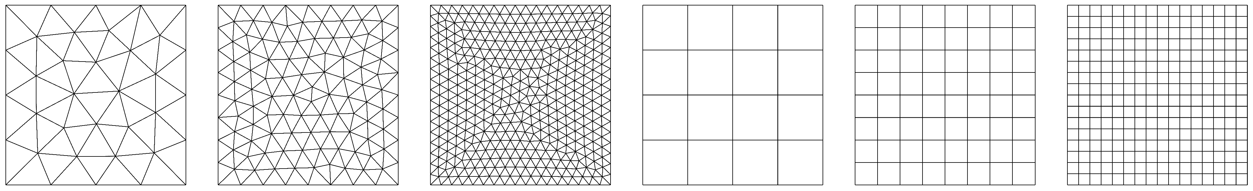 Figure 17. Computational grids for HCT, DM12 and DM22 elements (upper diagrams) and for the BFS element (lower diagrams).
