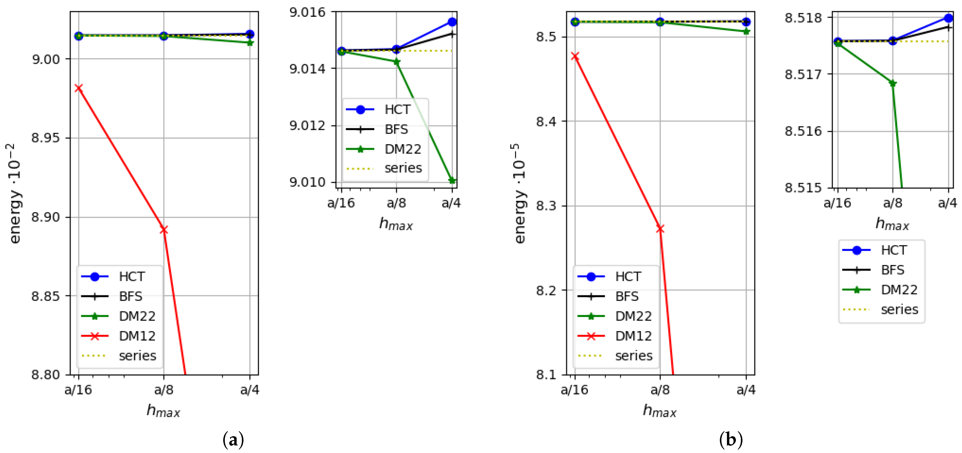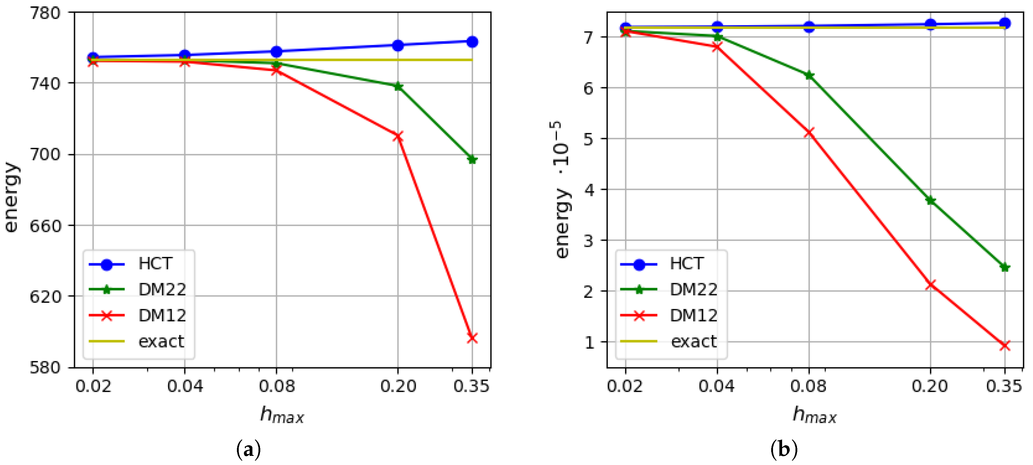 Figure 15. Efficiency comparison for triangular elements HCT, DM12, DM22 and DRM (discrete Reissner–Mindlin [35]): (a) for h = 1.0 ; (b) for h = 0.1 . The simply supported, circular plate.