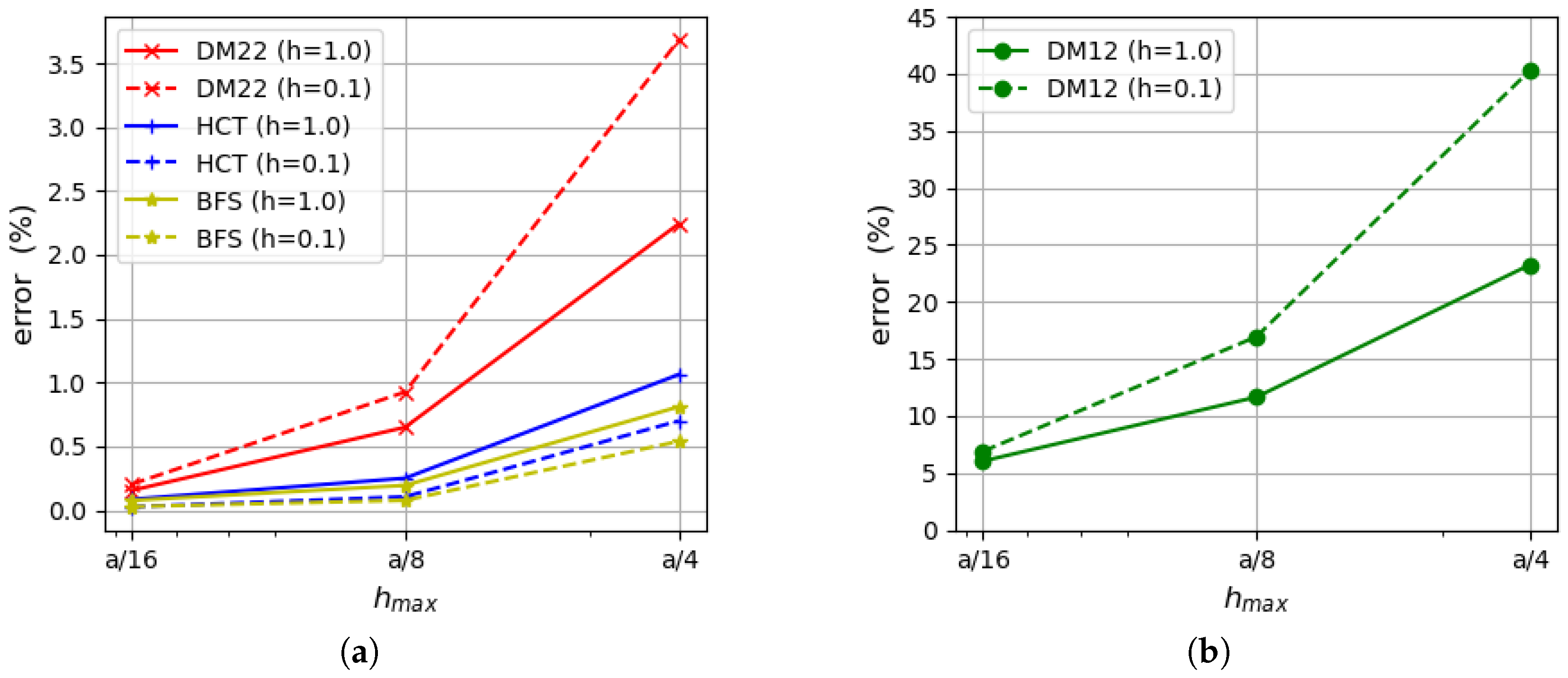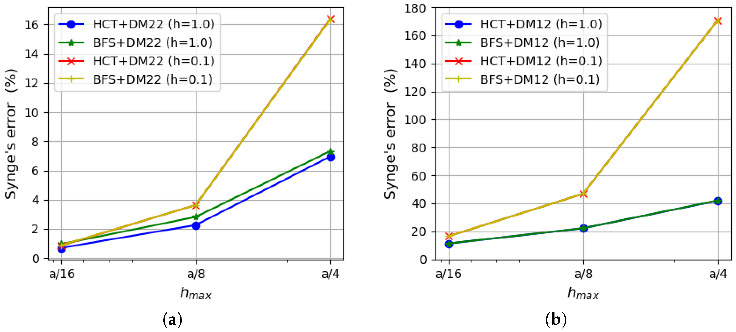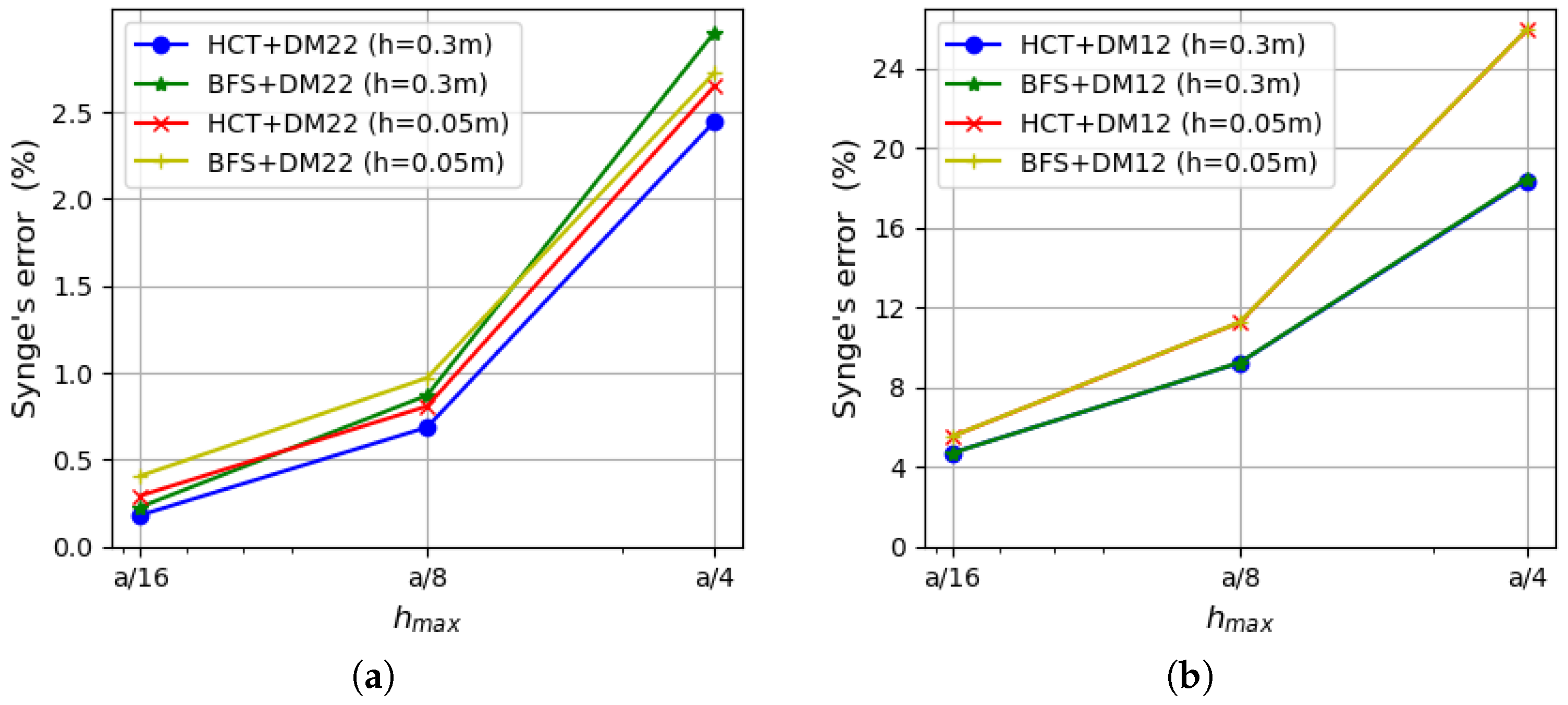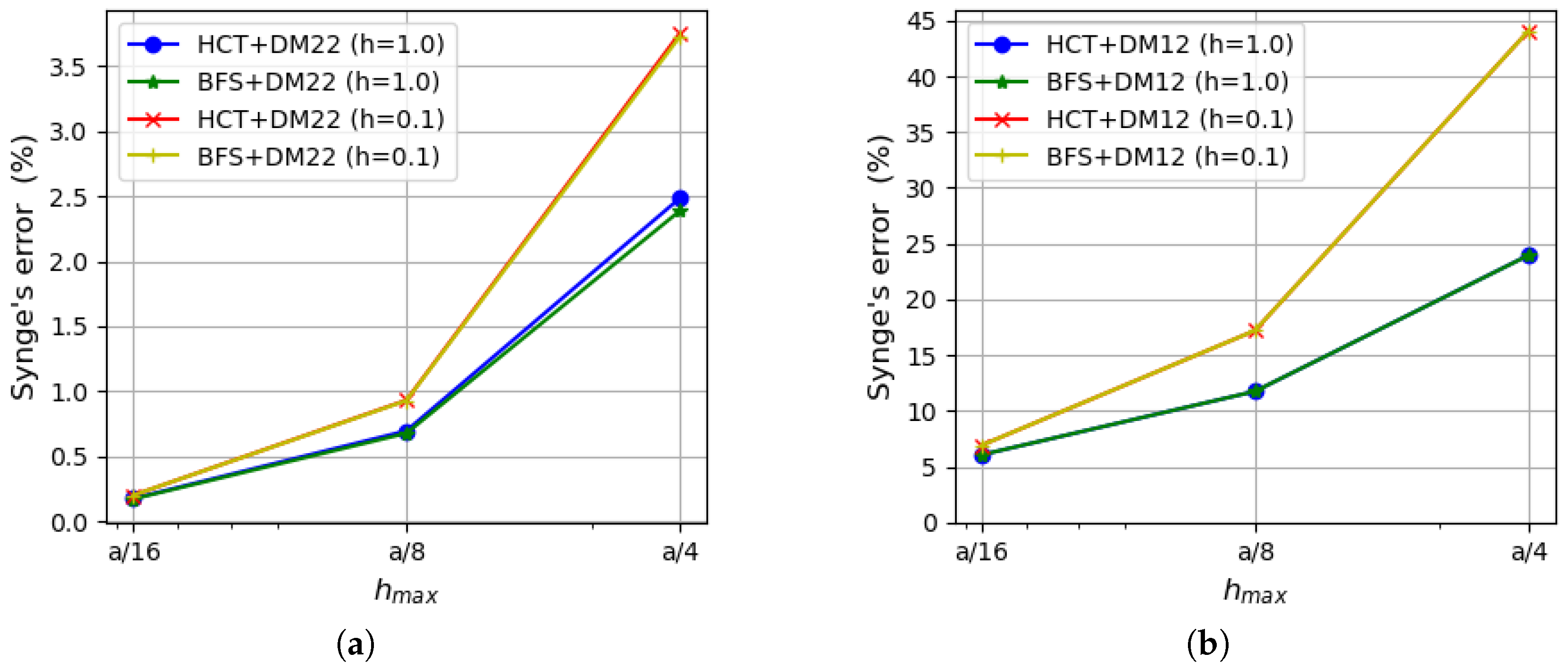 Figure 11. Synge’s error depending on the maximum size of plate elements: (a) using the DM22 element and stress-based elements; (b) using the DM12 element and stress-based elements.