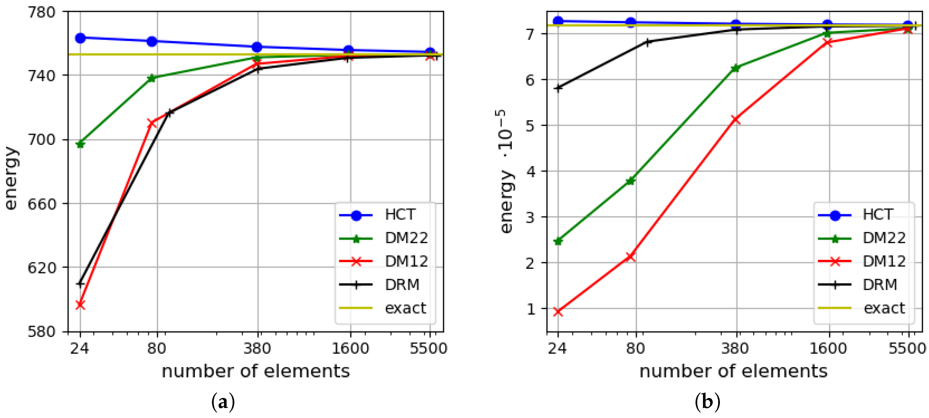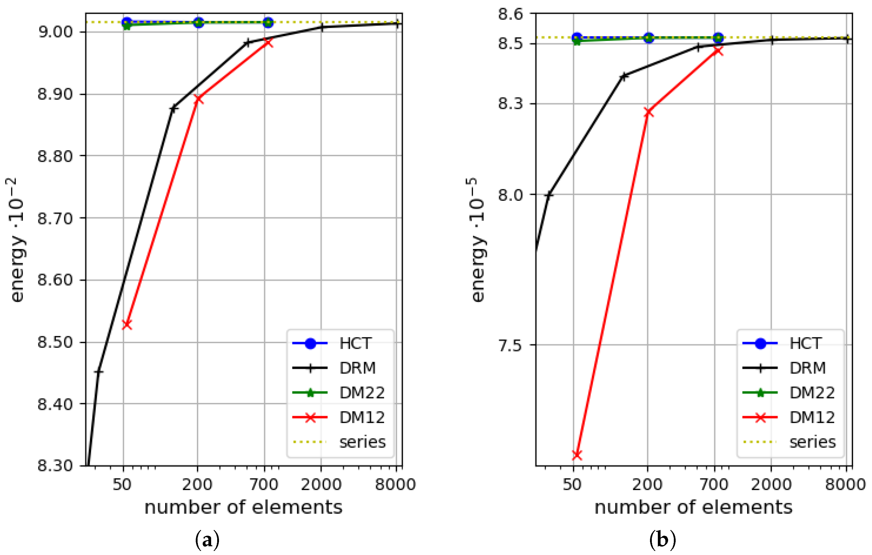 Figure 9. Efficiency comparison for triangular elements HCT, DM12, DM22 and DRM (discrete Reissner–Mindlin [35]): (a) for h = 1.0 ; (b) for h = 0.1 . The simply supported, rectangular plate.