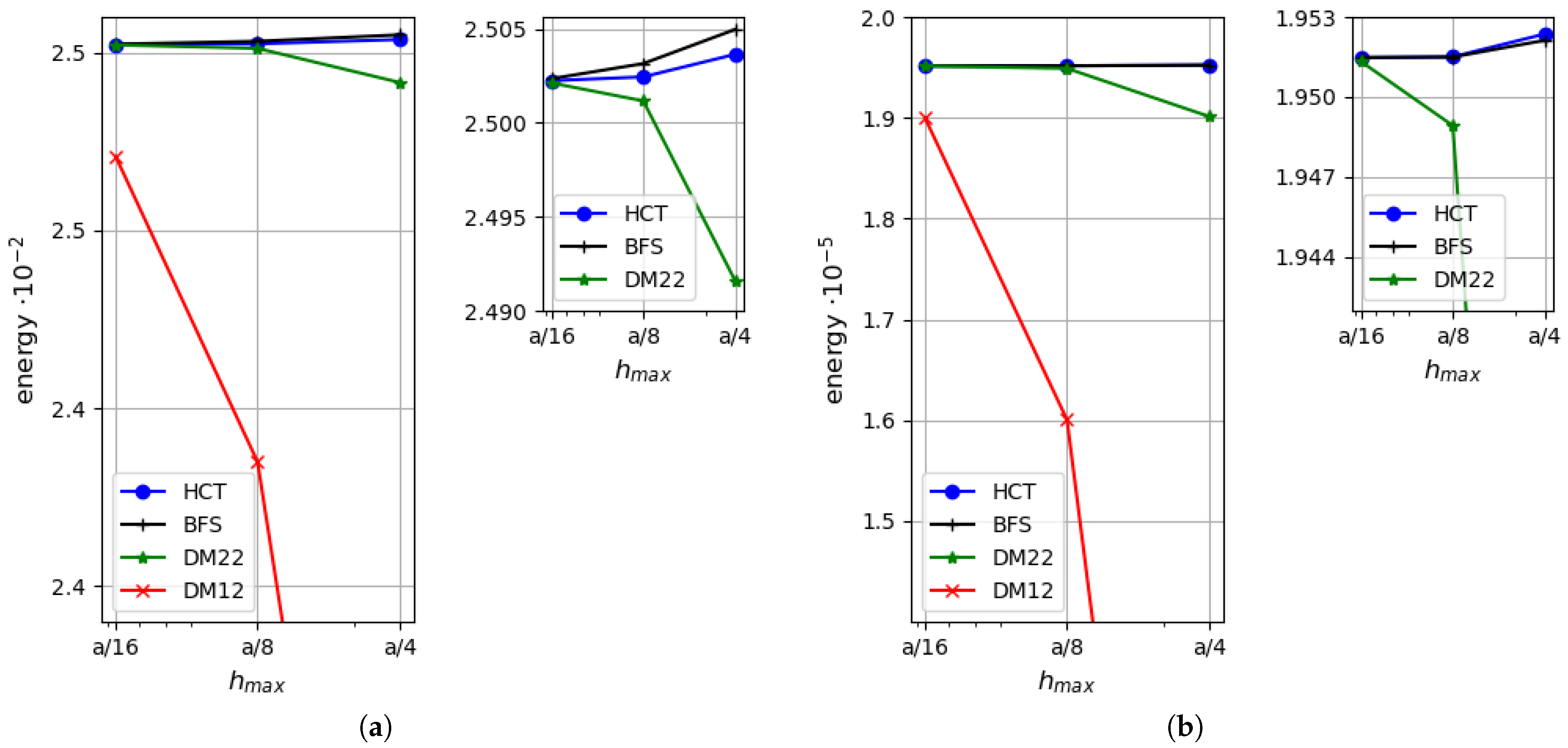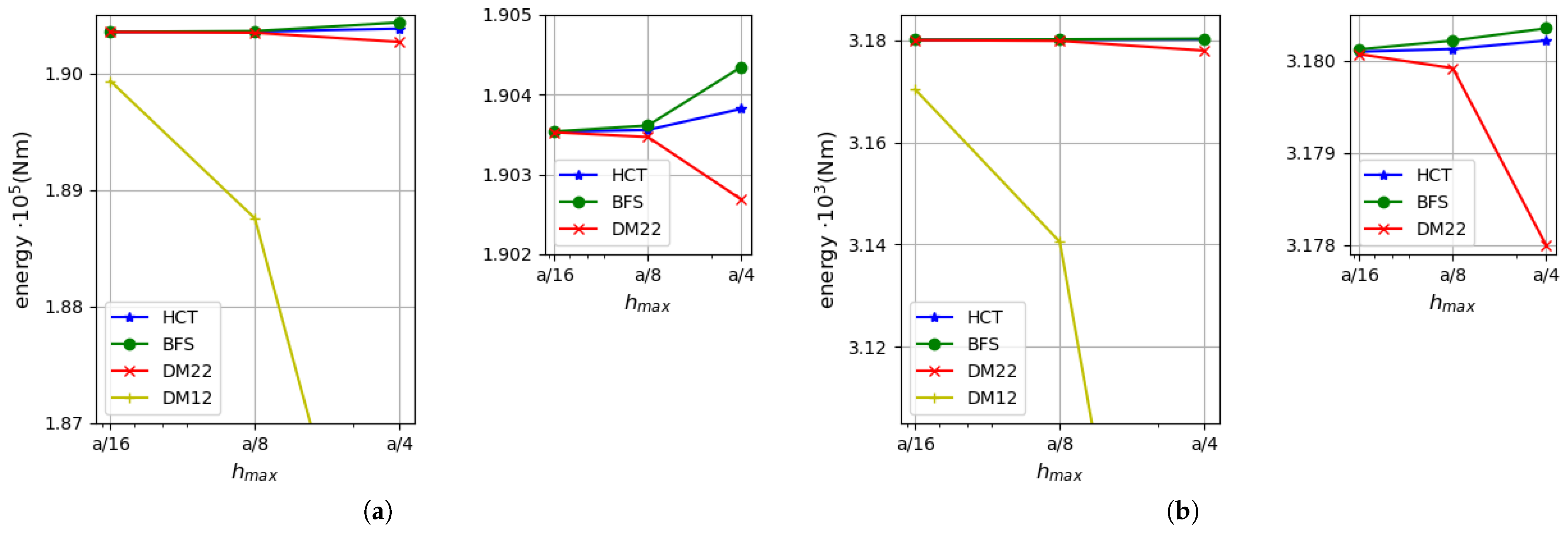Figure 8. Relative error of approximate solution calculated on the basis of Equation (65): (a) for the DM22, BFS and HCT elements; (b) for the DM12 element.