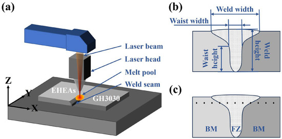 (a) Schematic diagram of the dissimilar laser welding process; (b) Schematic diagram of the welded joint morphology parameters; (c) Schematic diagram of hardness testing (BM–Base material, FZ–Fusion zone).
