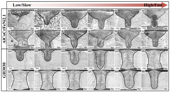 Figure 2 shows the welded joint morphology of AlCoCrFeNi2.1 eutectic high-entropy alloy and GH3030 high-temperature nickel-based alloy under different laser power and welding speed settings. It is evident that, compared to GH3030, AlCoCrFeNi2.1 eutectic high-entropy alloy exhibits a wider weld width and a narrower neck width under the same welding parameters. The AlCoCrFeNi2.1 eutectic high-entropy alloy exhibited a distinct “nail-shaped” weld morphology, characterized by a wider upper weld region and a narrower, deeper lower section with a relatively flat top surface. In contrast, the GH3030 superalloy showed more moderate variations in weld width and penetration depth, primarily due to the differences in thermal conductivity between the two materials. According to relevant reports, the thermal conductivity of the AlCoCrFeNi2.1 eutectic high-entropy alloy is approximately 17.5 W/(m·K) [24,25], while that of GH3030 nickel-based high-temperature alloy is 25.1 W/(m·K) [26]. The higher the thermal conductivity, the faster the heat transfer, which means that materials with lower thermal conductivity are more likely to form “nail-like” welded joints during laser welding [27].