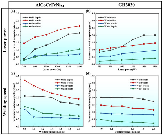 (a) Welded joint morphology parameters of AlCoCrFeNi2.1 eutectic high-entropy alloy under different laser power settings; (b) Welded joint morphology parameters of GH3030 nickel-based high-temperature alloy under different laser power settings; (c) Welded joint morphology parameters of AlCoCrFeNi2.1 eutectic high-entropy alloy under different welding speeds; (d) Welded joint morphology parameters of GH3030 nickel-based high-temperature alloy under different welding speeds.