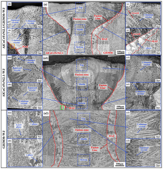 Microstructural morphology of welded joints: (a–e) Microstructure of the AlCoCrFeNi2.1/GH3030 welded joint (AlCoCrFeNi2.1/GH3030-WJ); (a1–e1) Microstructure of the AlCoCrFeNi2.1/AlCoCrFeNi2.1 welded joint (AlCoCrFeNi2.1-WJ); (a2–e2) Microstructure of the GH3030/GH3030 welded joint (GH3030-WJ).