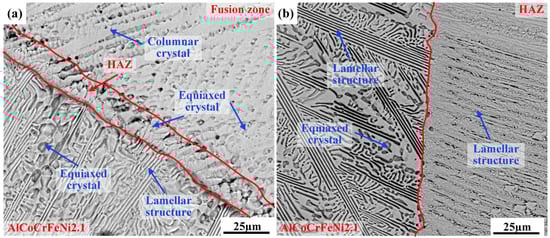 Due to the smaller HAZ on the AlCoCrFeNi2.1 side of the AlCoCrFeNi2.1/GH3030 joint and the AlCoCrFeNi2.1/AlCoCrFeNi2.1 joint, further magnified observations of the HAZs of both joints are shown in Figure 5. From the images, it is evident that the microstructure of the HAZ on the AlCoCrFeNi2.1 side of the AlCoCrFeNi2.1/GH3030 joint differs completely from that of the AlCoCrFeNi2.1/AlCoCrFeNi2.1 joint. Figure 5a shows a magnified view of the HAZ near the AlCoCrFeNi2.1 side of the AlCoCrFeNi2.1/GH3030 joint. The HAZ is mainly composed of equiaxed grains. The part of the fusion zone near the HAZ consists primarily of columnar and equiaxed grains, while the part of the base material near the HAZ is predominantly composed of lamellar structures and equiaxed grains. Figure 5b shows a magnified view of the HAZ of the AlCoCrFeNi2.1/AlCoCrFeNi2.1 joint. Unlike the HAZ of the AlCoCrFeNi2.1/GH3030 joint near the AlCoCrFeNi2.1 side, the HAZ in the AlCoCrFeNi2.1/AlCoCrFeNi2.1 joint is mainly composed of fine lamellar structures, and the base material near the HAZ has a structure similar to that of the AlCoCrFeNi2.1/GH3030 joint near the AlCoCrFeNi2.1 side, mainly consisting of lamellar structures and equiaxed grains.