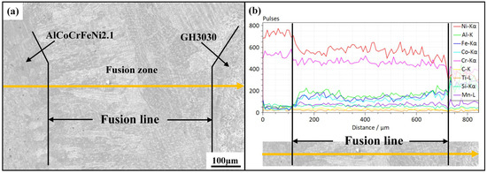 The EDS line scan results for the AlCoCrFeNi2.1/GH3030 welded joint: (a) location of the energy spectrum line scan; (b) energy spectrum of the line scan.