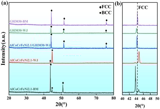 XRD phase analysis spectra: (a) XRD spectra for AlCoCrFeNi2.1 base material (AlCoCrFeNi2.1-BM), GH3030 base material (GH3030-BM), GH3030 welded joint (GH3030-WJ), AlCoCrFeNi2.1/GH3030 welded joint (AlCoCrFeNi2.1/GH3030-WJ), and AlCoCrFeNi2.1 welded joint (AlCoCrFeNi2.1-WJ); (b) XRD spectra for GH3030 base material (GH3030-BM), GH3030 welded joint (GH3030-WJ), and AlCoCrFeNi2.1/GH3030 welded joint (AlCoCrFeNi2.1/GH3030-WJ) with scanning angle from 30° to 40°.