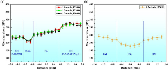 Microhardness of the welded joint under different laser welding process parameters: (a) Hardness distribution of AlCoCrFeNi2.1/GH3030 dissimilar material welded joint; (b) Hardness distribution of GH3030/GH3030 welded joint.