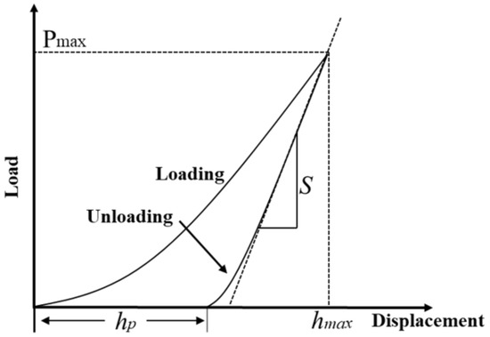 Nanoindentation testing consists of two parts: the loading process and the unloading process. Figure 10 illustrates the complete process of nanoindentation with the classical load–displacement curve. According to the Kick model [32], the relationship between load and displacement can be expressed as follows: