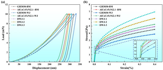 The mechanical properties of the welded joint are critical indicators of whether the joint quality meets the required standards. In this experimental study, due to the small size of the welded specimens, mechanical performance parameters such as tensile, bending, and impact properties could not be obtained. Therefore, nanoindentation testing was used on high-entropy alloys, nickel-based alloys, and dissimilar welded joints to directly obtain performance parameters such as hardness, elastic modulus, plastic work, and elastic work. By analyzing the load–displacement curve data, the stress–strain relationship in the weld zone was determined, and the yield stress of the high-entropy alloy, nickel-based alloy, and dissimilar welded joint was derived through inverse analysis.