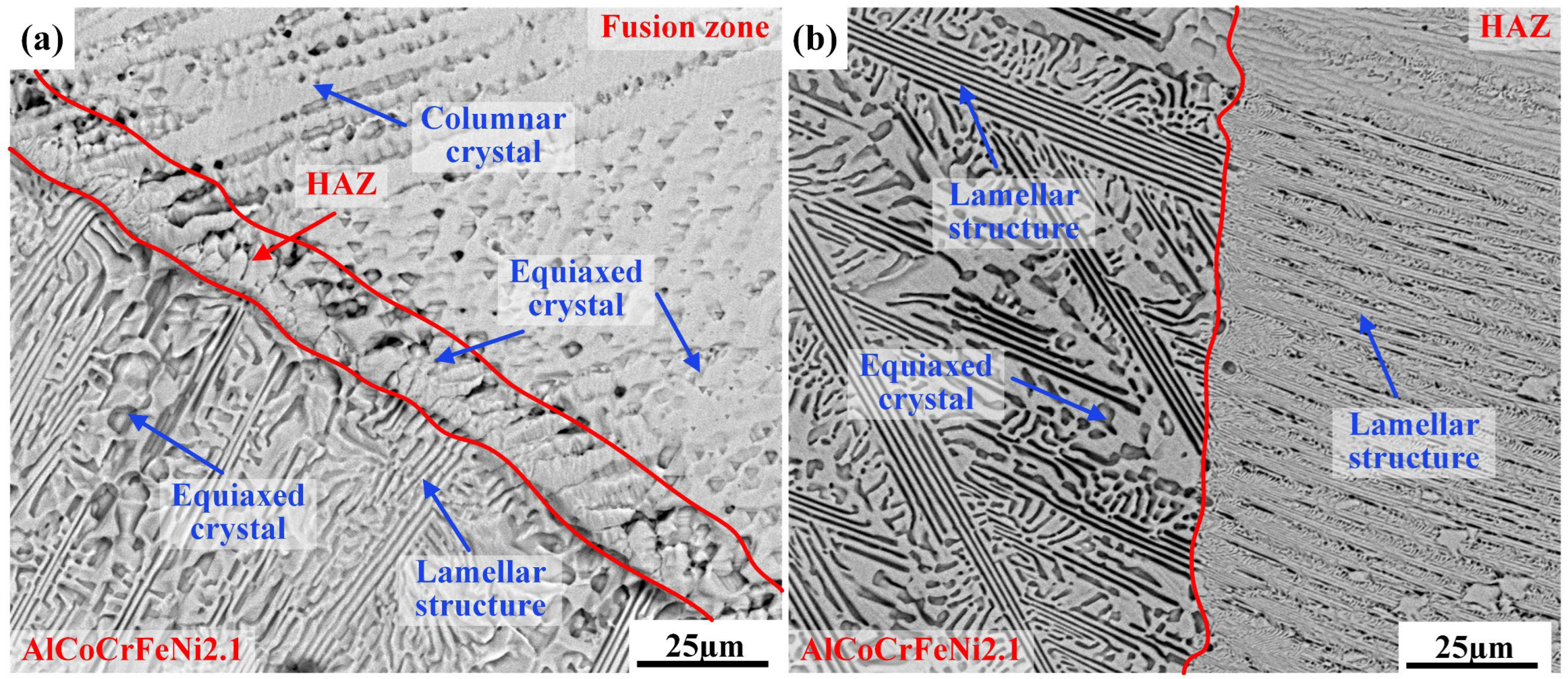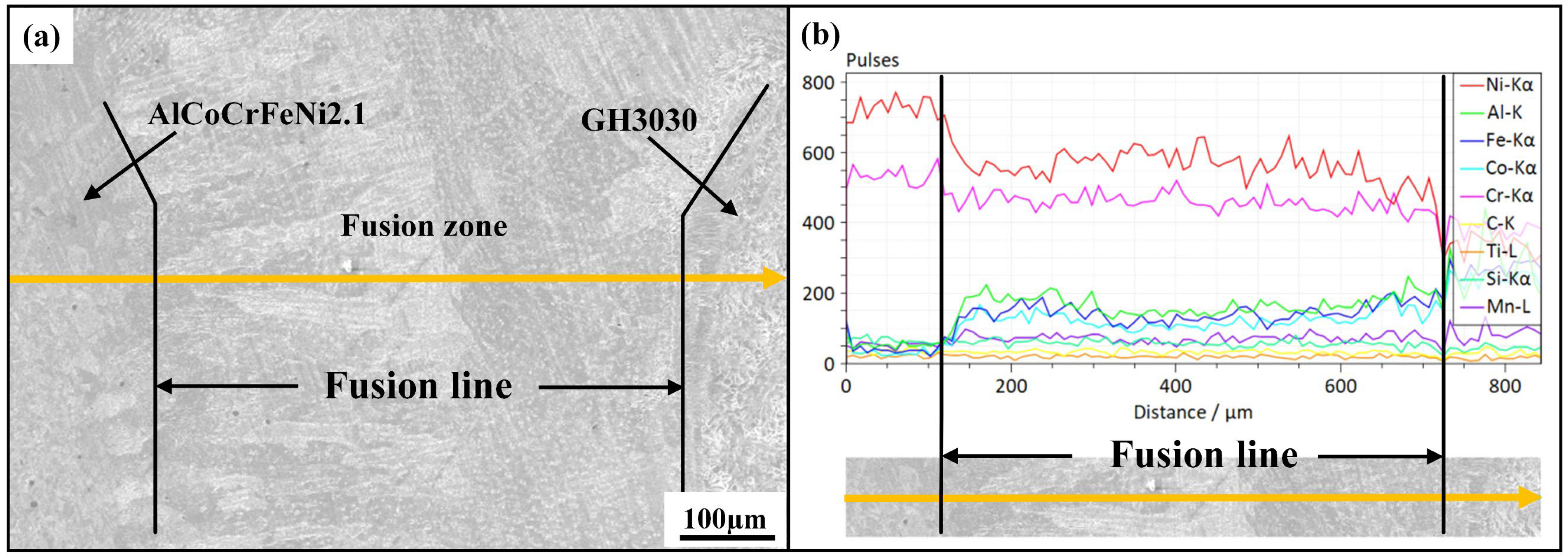 - Microstructural analysis of the AlCoCrFeNi2.1/GH3030 joint under welding conditions of 1350 W power and 1.2 m/min welding speed shows that there is no significant heat-affected zone (HAZ) near the AlCoCrFeNi2.1 side. The fusion zone consists of a large number of equiaxed and columnar grains, with a random distribution. On the GH3030 nickel-based superalloy side, a distinct, larger block-like structure in the HAZ is observed. The fusion zone grains are finer compared to the base material and consist of both columnar and equiaxed grains. The grain growth direction near the GH3030 nickel-based superalloy side is more uniform and perpendicular to the fusion line. No elemental segregation or impurity phases are found at the center of the weld, and the element distribution is relatively uniform.