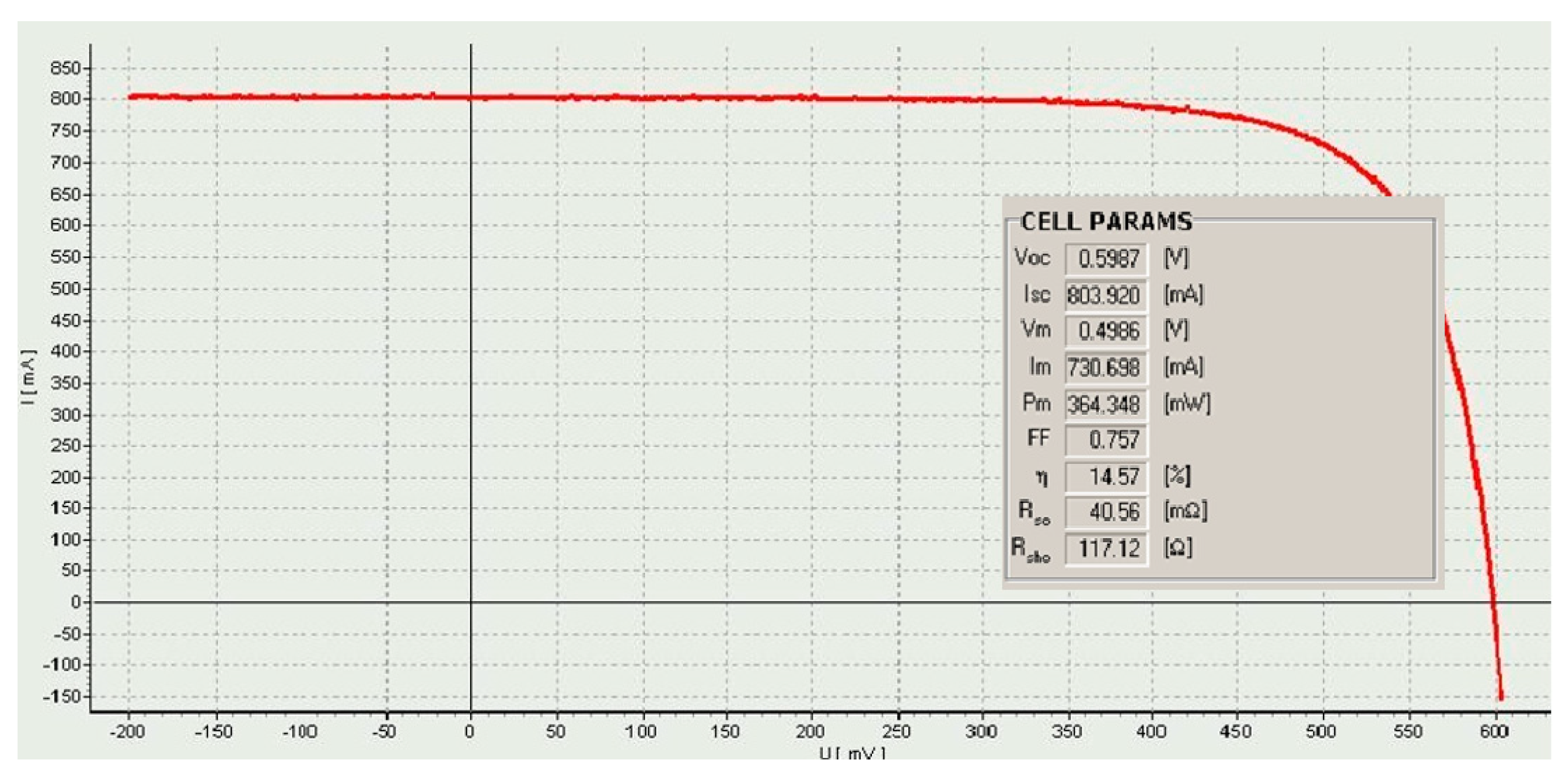 | Isc, mA | Uoc, mV | Pm, mW | FF | Eff, % | Rso@Uoc, mΩ | |