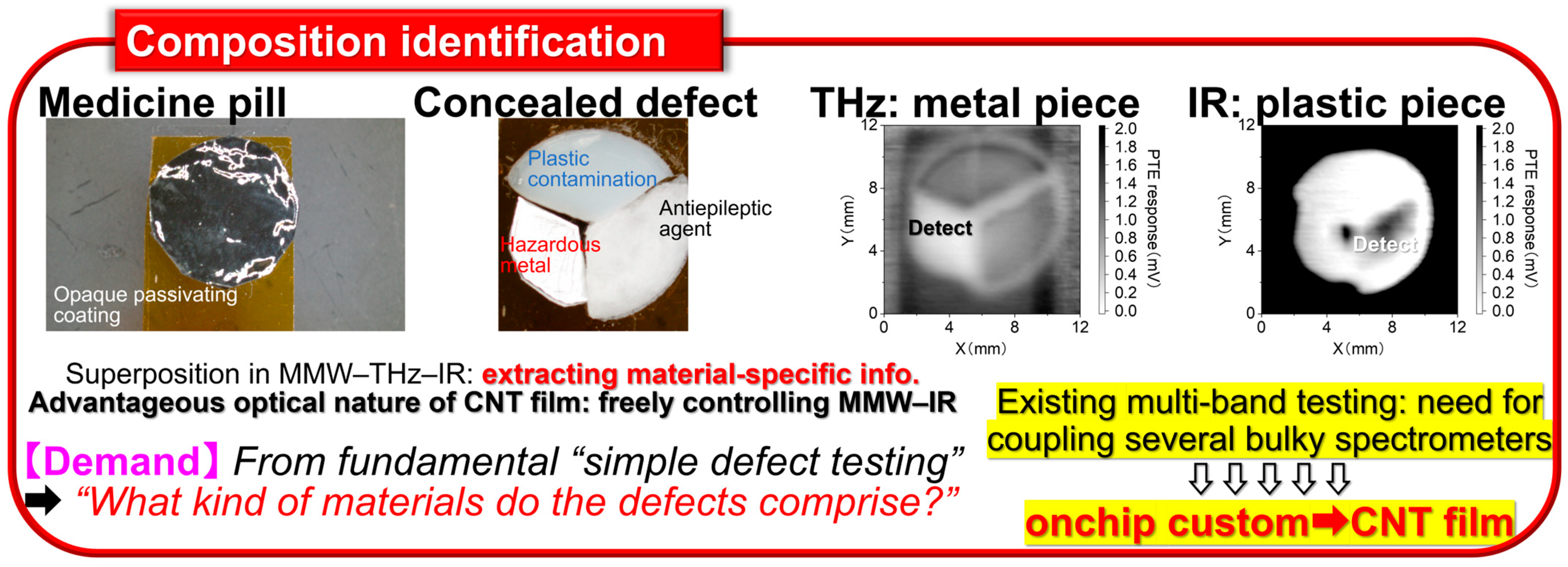 - Kubota, M.; Kinoshita, Y.; Hirokawa, S.; Shikichi, D.; Izumi, N.; Hagiwara, N.; Sakai, D.; Matsuzaki, Y.; Yamamoto, M.; Takai, L.; et al. In-line multi-wavelength non-destructive pharma quality monitoring with ultrabroadband carbon nanotubes photo-thermoelectric imaging scanners. Light Sci. Appl. 2025, 14, 306. [Google Scholar] [CrossRef] [PubMed]