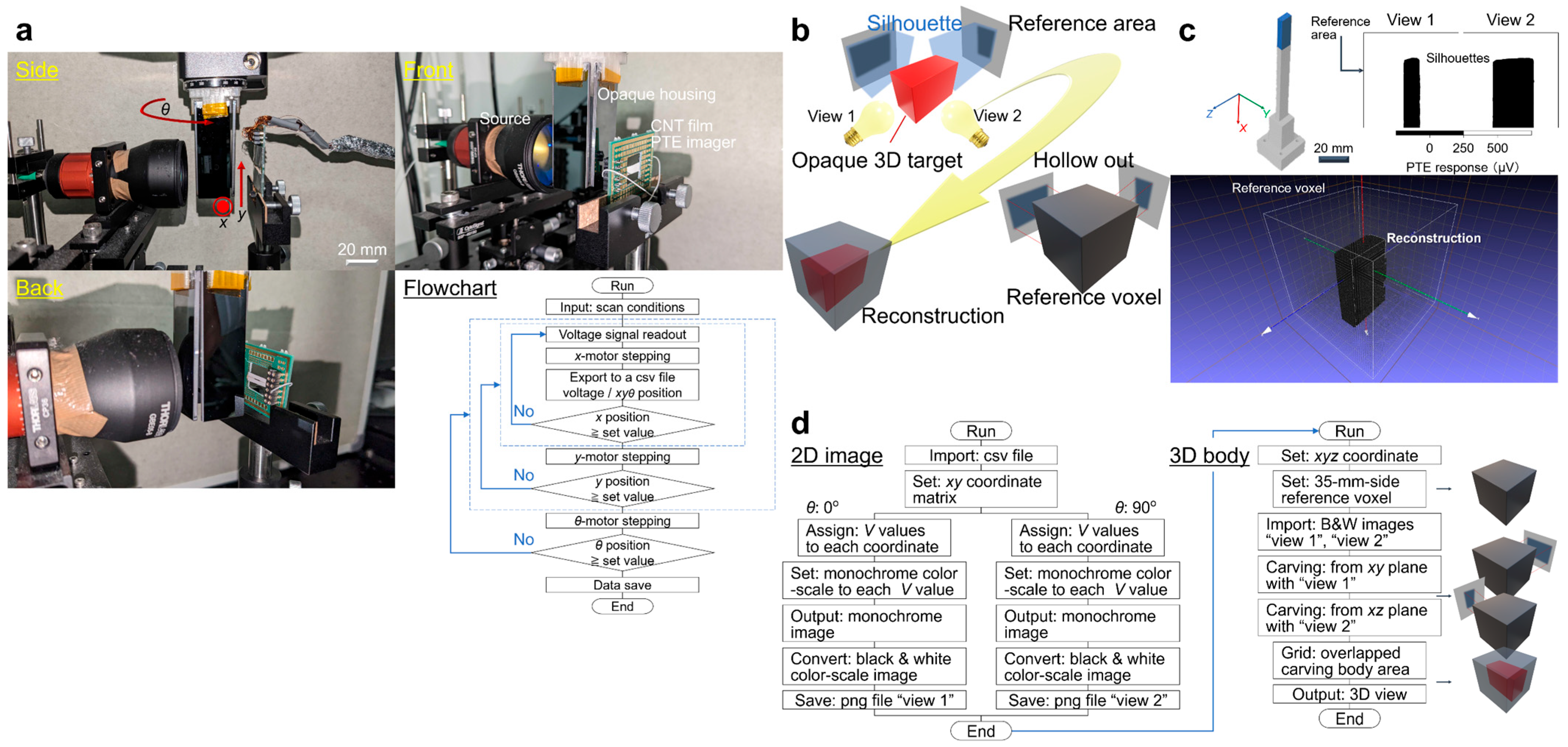 - Li, K.; Kinoshita, Y.; Shikichi, D.; Kubota, M.; Takahashi, N.; Zhang, Q.; Koshimizu, R.; Tadenuma, R.; Yamamoto, M.; Takai, L.; et al. Simple Non-Destructive and 3D Multi-Layer Visual Hull Reconstruction with an Ultrabrandband Carbon Nanotubes Photo-Imager. Adv. Opt. Mater. 2024, 12, 2302847. [Google Scholar] [CrossRef]