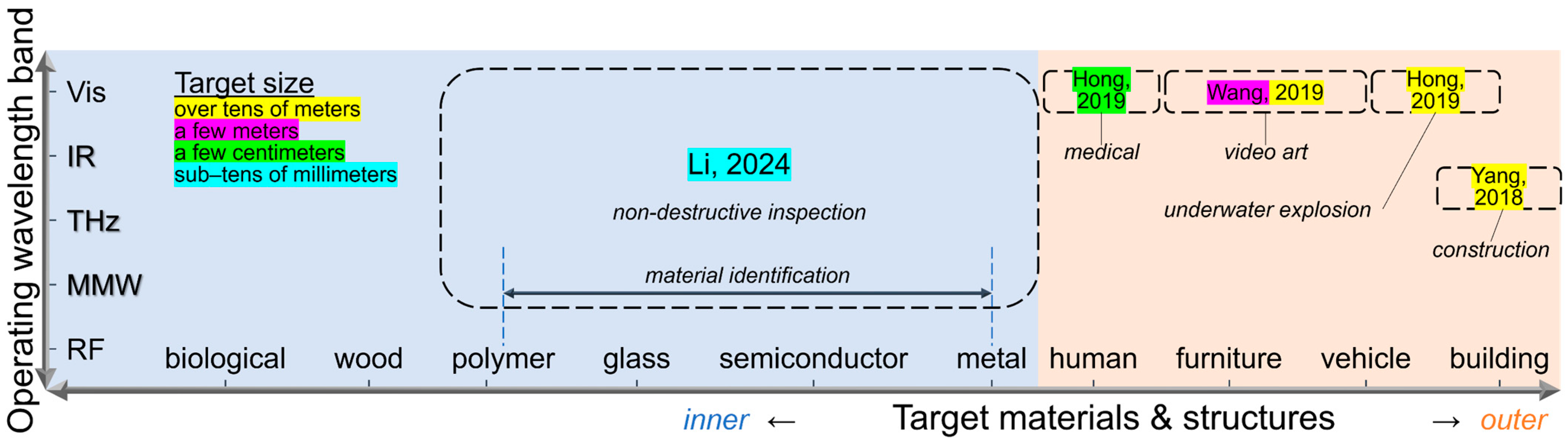 | sub-THz LiDAR [85] | 3 mm | N.A. | 130 s per picture | Meters-size desk | Non- invasive | 10 k$ | Indoor (in dried air) | Cardboards, metals |