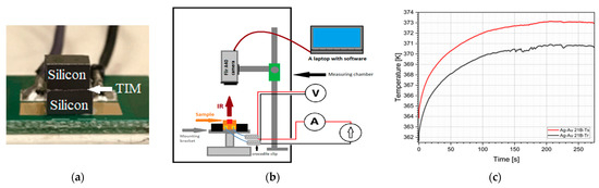 Thermal Analysis. The specimens for thermographic analysis were made of thick silicon (3000 μm) to allow for precise alignment of the measurement areas on both surfaces and within the TIM region, where the geometry was adapted to the used equipment requirements. They were attached to FR-4 wafers using Amepox’s silver-based conductive adhesive, applied using a 400 μm thick polyimide film template. The silicon chip was then mounted using the MM500 (Mechatronika, Warsaw, Poland) pick-and-place robotic system. The adhesive was cured in a JEM 310 (OK Industries, Mumbai, India) convection oven for 15–20 min at 150 °C, after which the samples were cleaned with isopropanol. The final step was to solder the power wires and apply a 0.98 emissivity layer using Helling 3-D Laserscanning Anti-Glare-Spray (Helling GmbH, Heidgraben, Germany) (Figure 2a), where the delivered electrical power was controlled by a power supply and monitored by multimeters for voltage and current measurements. The samples were placed in a measurement chamber (Figure 2b) with monitored environmental conditions. Measurements were calibrated taking into account the atmospheric temperature and humidity of the air in the measurement chamber, the distance between the camera and analyzed object, and the reflected (apparent) temperature, that is, the mean temperature of the surrounding objects. The heat source was powered to maintain steady-state conditions, ensuring a stable temperature of 100 °C or 373 K (Figure 2c). The temperature difference between the heat source and receiver was recorded, and the thermal resistance (RTH) was calculated using Formula (1):