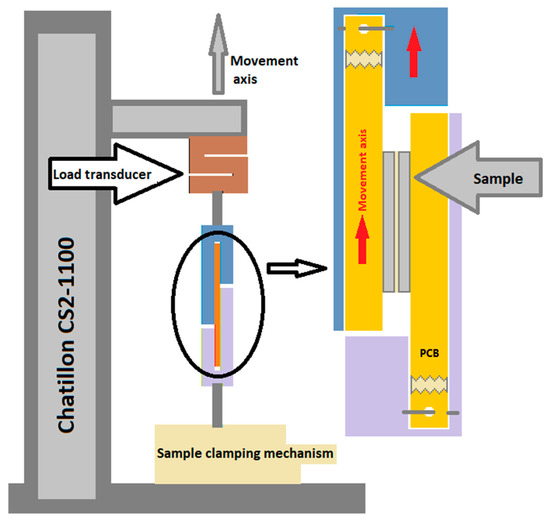 Mechanical analysis was conducted to evaluate the shear force of the sintered materials on a Chatillon CS2-1100 (Ametek, American Machine and Metals, Berwyn, PA, USA) stretching machine. The CS2-1100 ensures automatic data acquisition up to 1000 Hz with several different test stop conditions (force drop, sample break, max force/elongation, cycles, etc.). The samples for these tests were prepared using 400 µm thick silicon substrates, which were glued onto FR-4 laminates using cyanoacrylate adhesive. The prepared samples were placed in 3D-printed grips. A micrometer screw was used to precisely position the sample so that it was perpendicular to the substrate. The grips used ensured stable, vertical positioning of the sample during measurements and caused the force to act along the plane of the sample surface. Samples were tested in the pull-to-break regime, and the load cell limit was 1000 lbs (~4500 N). The higher the shear strength, the better. A schematic view of the experimental setup is shown in Figure 3.
