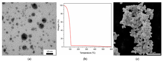 AuNPs: (a) TEM images; (b) TGA analysis of colloids after a lyophilization process; (c) SEM images of silver microplates.