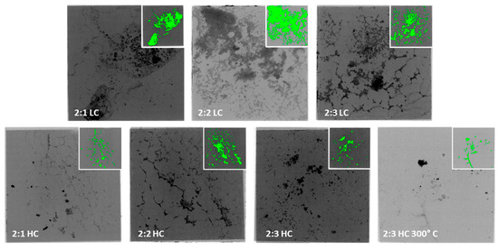 In order to assess the quality and coverage of silicon chips with the TIM layer, a series of X-ray images of the sintered samples was taken (Figure 6). Then, using advanced image thresholding software, the images were analyzed to identify voids and defects, and to examine the quality of the sintered joints, with the coverage ratio calculated through image processing (Figure 7). In analyzing the results of the measurements, it can be concluded that materials containing twice as much solvent (2:1 LC, 2:2 LC, 2:3 LC) were characterized by the highest surface coverage of the chips, while reducing the solvent content drastically decreased the quality of the surface coverage. This is related to the lower viscosity of the paste, allowing for a more even coverage of the substrate to be obtained. Due to the use of gold nanoparticles in the materials, which cannot be visualized in X-ray images, there is a possibility that these surfaces were covered with the tested material so uniformly that it was not accurately detected. This method can effectively identify only agglomerates of sintered particles and pores present on the chip contact surface [23].