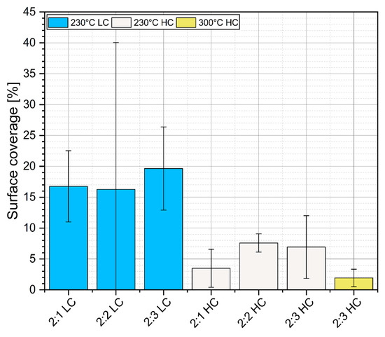 The sintering process was carried out in a Binder FD Classic Line (Binder GmbH, Tuttlingen, Germany) convection dryer at 230 °C for 1 h preceded by a 1 h heating period with a 4 °C/min temperature increase. Once sintering was complete, the samples were slowly cooled to avoid thermal shock, which could weaken their mechanical properties or lead to damage. In addition, a separate sintering experiment was carried out at a temperature of 300 °C (2:3 HC batch material).