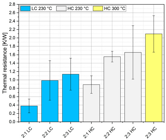 Another conclusion arising directly from the analysis of the results is that the difference in thermal resistance across the series (between the lowest resistance value of 2:2 LC and the highest of 2:3 HC at 300 °C), is equal to 70%, indicating the significant influence of solvents and process temperature on the resistance value. It can be seen that the influence of gold increased the thermal resistance and directly correlated with the thermal conductivity of gold (continuous layer). The thermal resistance of gold is significantly higher than the thermal resistance of silver, so it is understandable that the addition of gold will increase both the process temperature and the thermal resistance (Figure 8).
