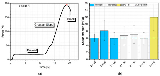 In the process of measuring the force at which the specimens broke, a graph was obtained for each specimen, indicating the value of force at which the specimen failed (Figure 9a). We analyzed maximal shear strength, that was marked with red dot in the Figure 9a. In order to present the measurement results in the form of shear strength, it was necessary to convert the value of the obtained force into strength, calculated using Formula (2):