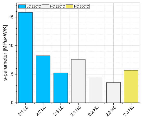 As a result of these processes, the sintered layer becomes homogeneous (with minimal porosity) [30] and, due to the increased packing density of the particles, there is an improvement in the mechanical strength of the bond and a significant increase in thermal conductivity [29,32]. With this in mind, a comparative parameter was introduced that took into account the two most critical properties (with respect to sintered-layer quality): shear strength and thermal resistance. The ‘s’ parameter, defined by Equation (3), is their ratio; the higher its value, the better. The results of the comparative analysis are presented in Table 4 and the chart in Figure 11.