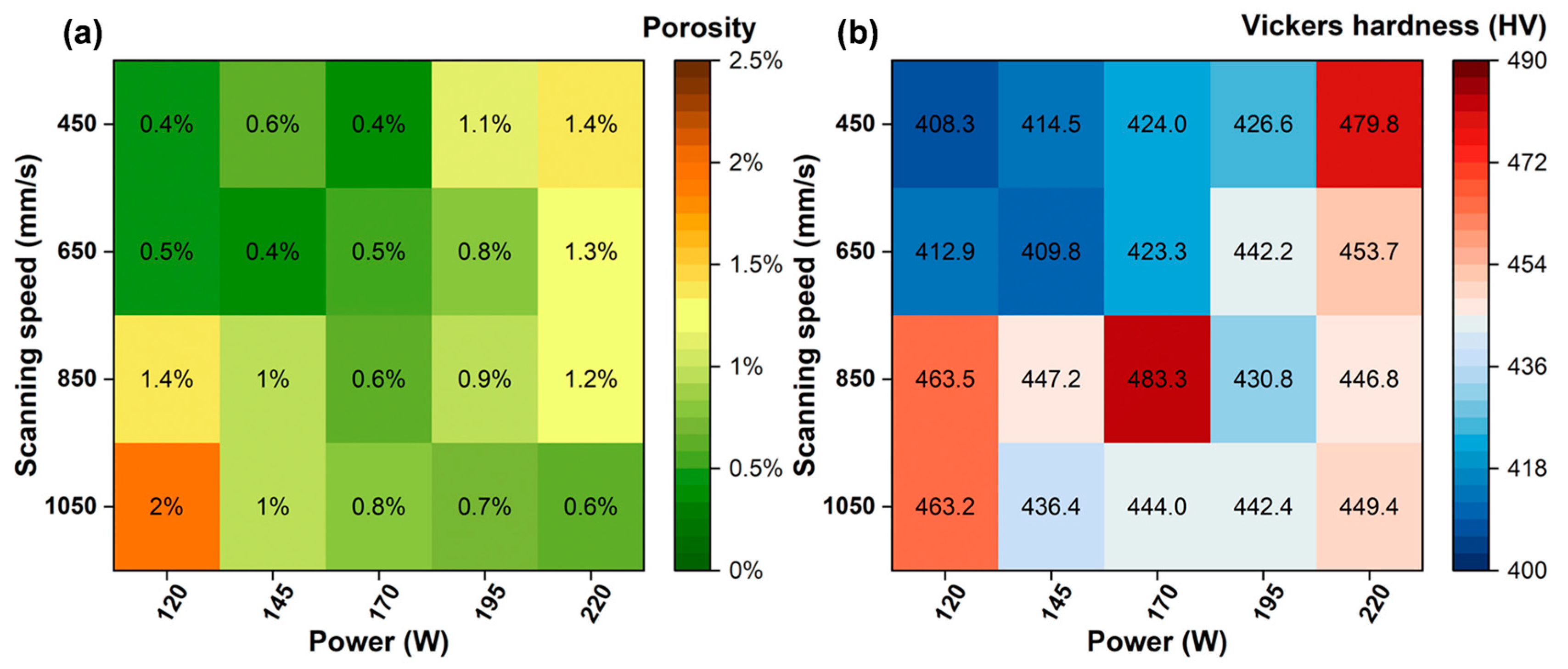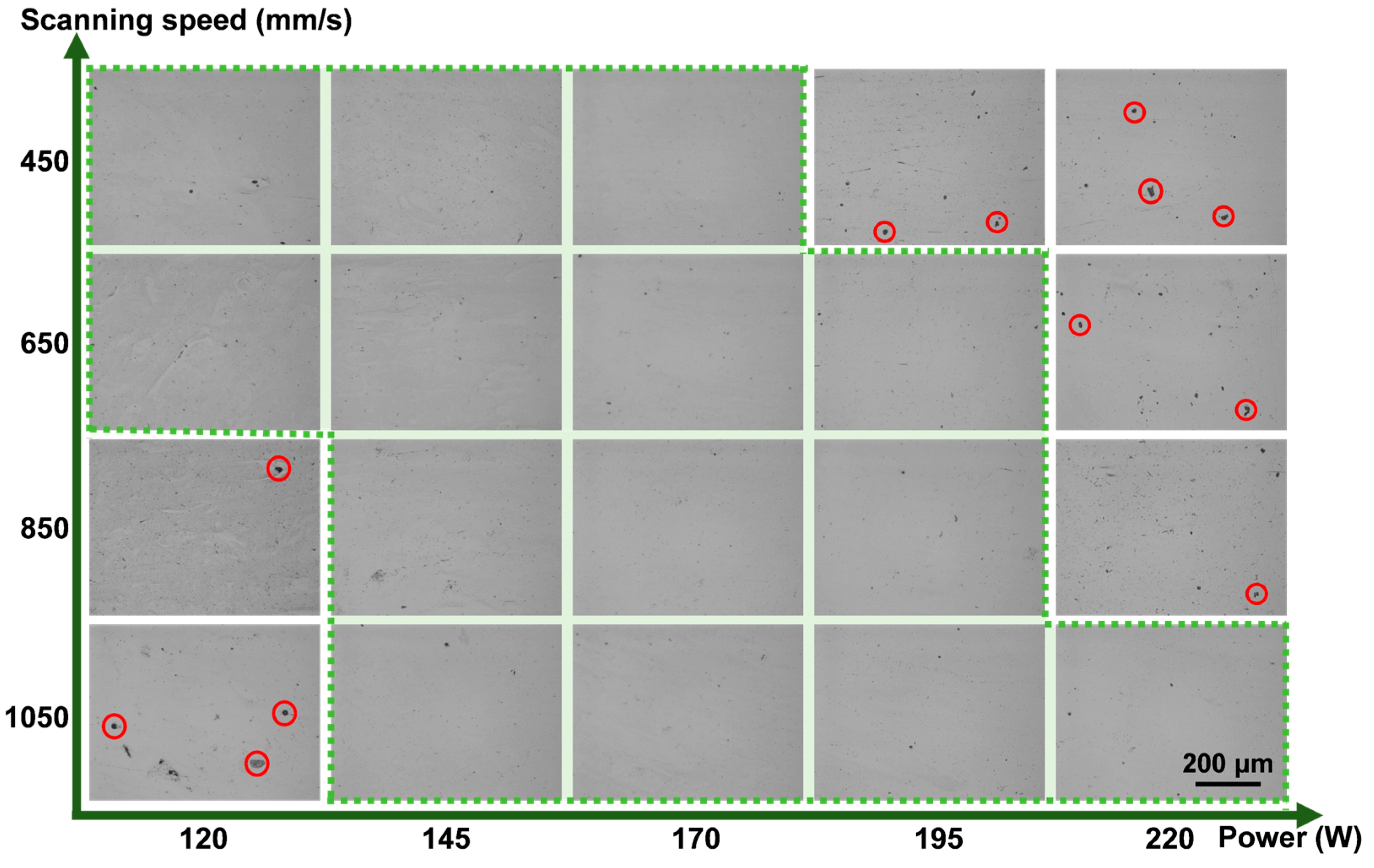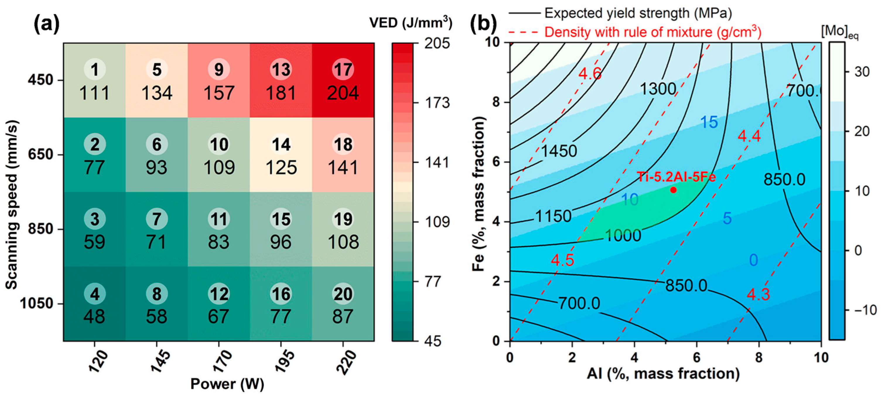 - The Ti-5.2Al-5Fe alloy, designed based on criteria of density, strength, and β-phase stability, achieved high densification (porosity generally ≤ 2%) across a wide energy density range of 48–204 J/mm3. The synergistic effects of Al (improving melt pool wettability) and Fe (lowering the liquidus temperature) collaboratively broadened the process window.