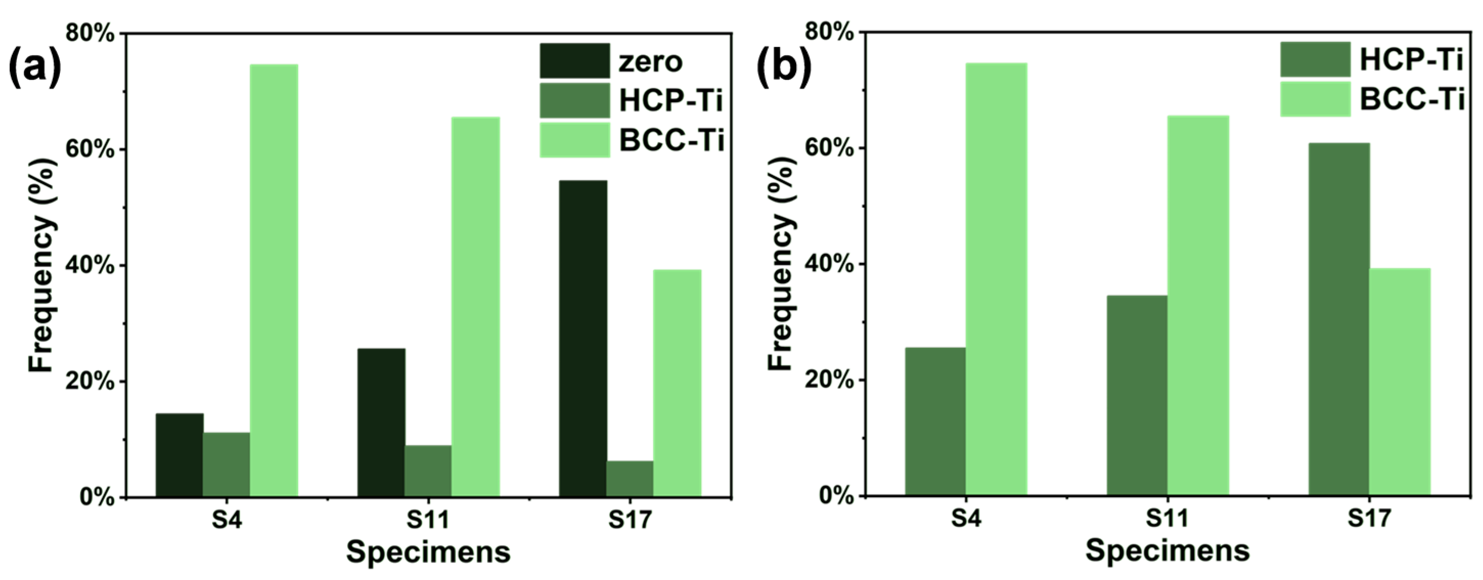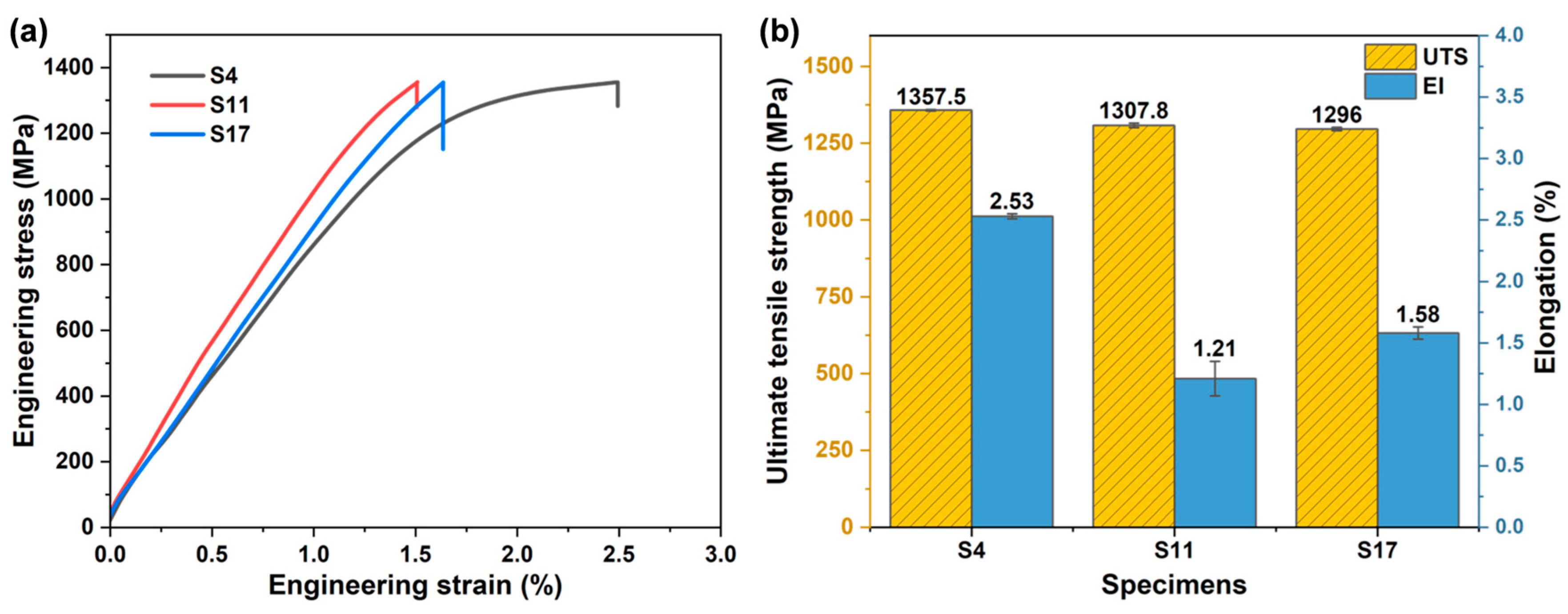 - The alloy exhibited high strength but low ductility in the as-deposited state, with tensile strength exceeding 1290 MPa but elongation generally below 2.6%. The high strength originated from heterogeneous structures and solid-solution strengthening, while the limited ductility was primarily attributed to residual stress concentration in the α-phase regions.