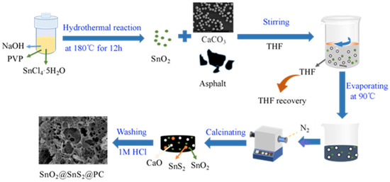 (2) Synthesis of SnO2/SnS2@PC composite. First, 50 mL of tetrahydrofuran (THF) and 7.5 g of asphalt were added sequentially into a 100 mL beaker and stirred until completely dissolved. Then, 0.5 g of SnO2 and 2 g of CaCO3 were added to the solution and stirred continuously for 30 min. Next, the mixture was transferred to a rotary evaporator and heated in a water bath at 90 °C to recover the THF. We transferred the resulting residue to a ceramic crucible, placed it in a tube furnace, and calcinated at 900 °C for 2 h under a nitrogen atmosphere. After natural cooling, the calcined residue was alternately washed with 1 M HCl solution and pure water three times to remove the CaO produced by the decomposition of CaCO3, and finally, it was dried in a vacuum oven at 80 °C. The obtained product was denoted as SnO2/SnS2@PC, where the SnS2 was formed by the combination of sulfur elements in asphalt and Sn in SnO2, which can be confirmed by the analysis results of XRD and XPS. For comparison, the SnO2/SnS2@C and pure carbon samples were prepared in the absence of CaCO3 or SnO2 and CaCO3 under the same conditions, respectively. The schematic procedure preparation of SnO2/SnS2@PC is illustrated in Figure 1.