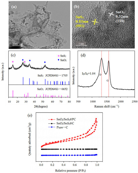 (a) TEM image of SnO2/SnS2@PC; (b) HRTEM image of SnO2/SnS2@PC; (c) XRD patterns of SnO2/SnS2; (d) Raman spectrum; (e) N2 adsorption isotherms.